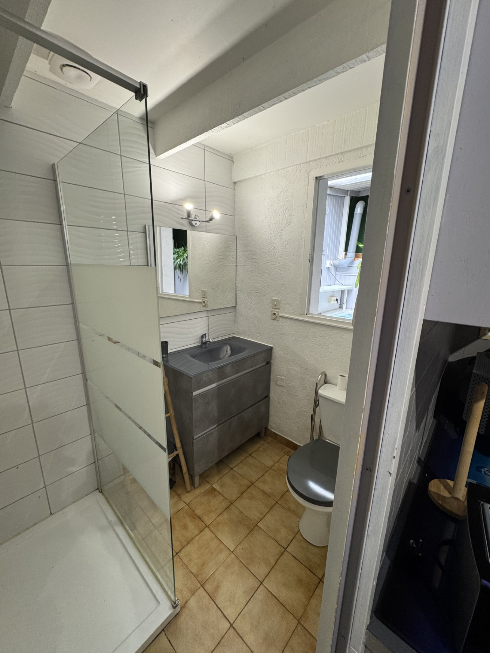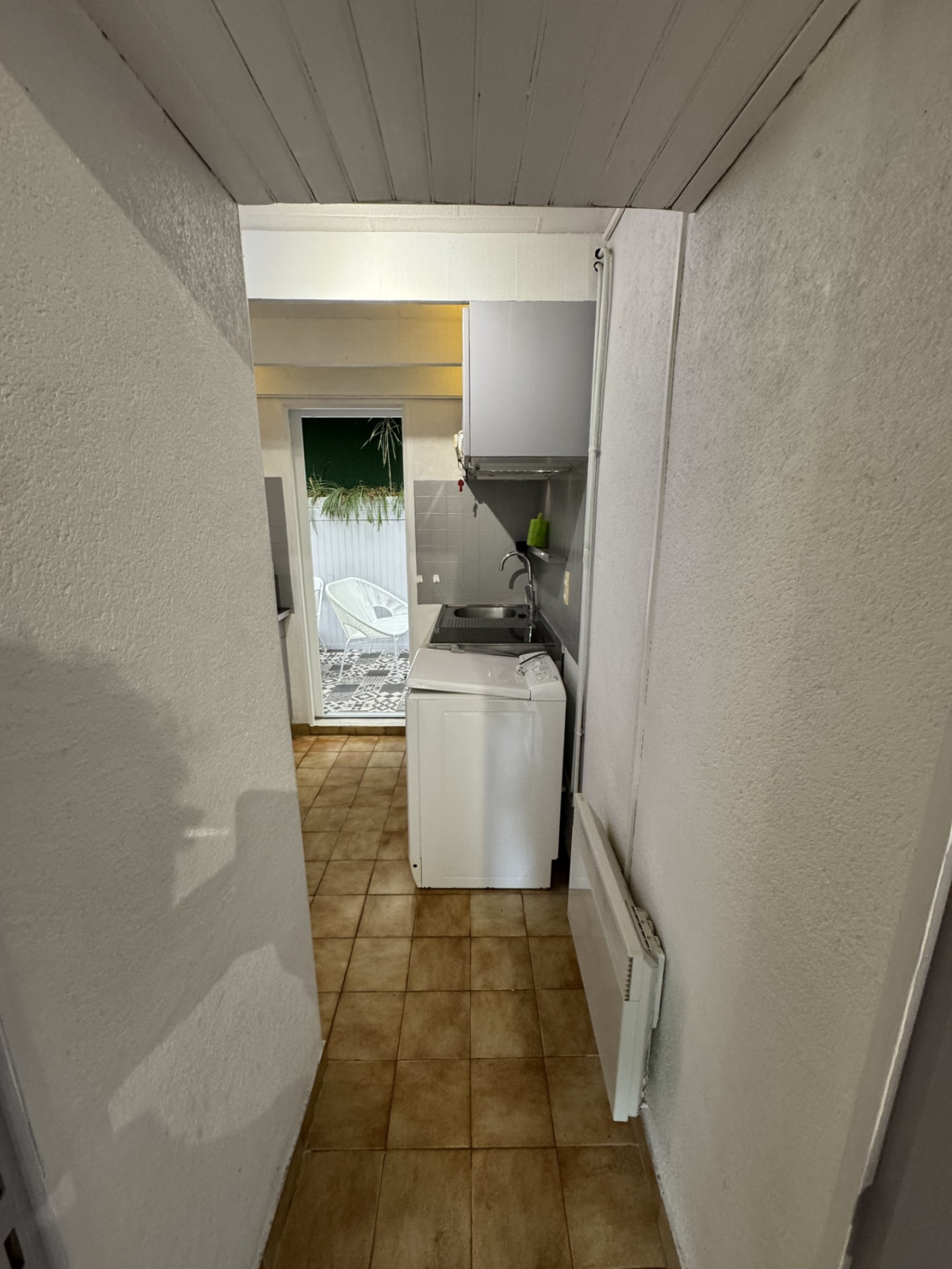 Entrée, une chambre avec rangement, une petite cuisine séparée, une salle d'eau avec wc et un patio.